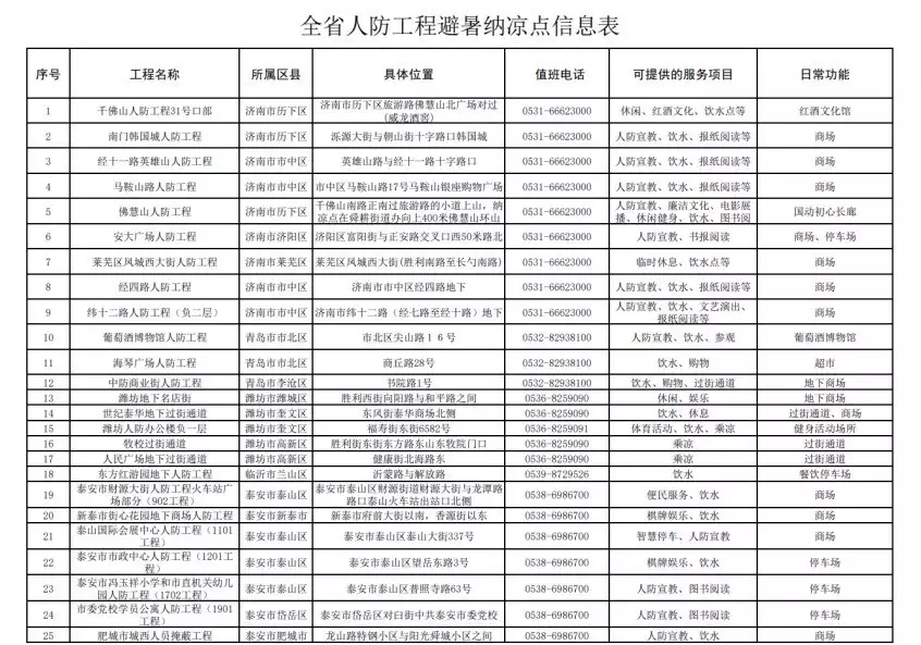 为群众提供避暑纳凉服务,利用人防工程提供清凉的地下超市、商场、便民市场、停车服务等便民场所;增加桌椅、饮水设施、报刊杂志、健身器材等设施;设置休闲区、棋牌区、阅读角、餐饮区等。