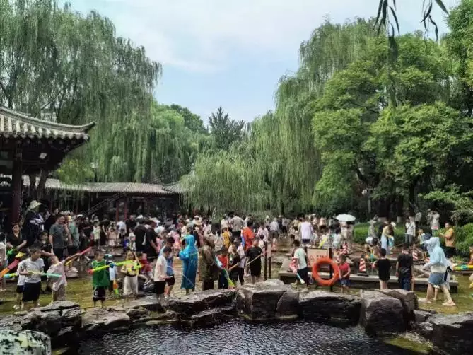 不戏一把五龙潭的泉水,都不算过了济南的夏天。踏入五龙潭公园,一片欢声笑语,小朋友们光脚踏入清凉的水池,手持水枪玩得不亦乐乎。泉水清澈,打一场水仗,炎热随水花消散。