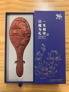 气垫梳选用天然紫檀为原材料,以传承300年的省级非遗“嘉祥木雕”为制作工艺,匠心雕琢,千次打磨。梳齿呈水珠状,不伤头皮。梳面柔软精致,梳刮头皮后有按摩效果,能够促进血液循环。也可用梳子背面拍打身体,起到缓解疲劳的功效。梳子背面图案取自山东省会济南的“天下第一泉”一一趵突泉,并以大明湖荷花作为衬托。画面采用浮雕工艺,图案立体,造型饱满,极富齐鲁意蕴。