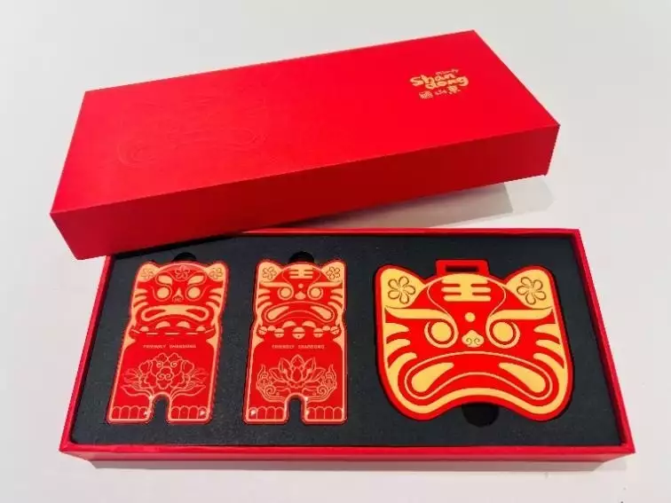 好客山东“泥叫虎”文创产品,以传统泥叫虎为设计原型,以中国红为底,喜庆热烈;有牡丹和荷花纹样绘于胸前,包蕴吉祥富贵、和和美美寓意;有梅花纹样绘于耳上,寄托花中君子奋发向上情结。“泥叫虎”冰箱贴和行李牌,传统非遗,焕新活力。居家与旅行,皆有祥瑞之虎相伴,虎虎生威又福慧绵延。