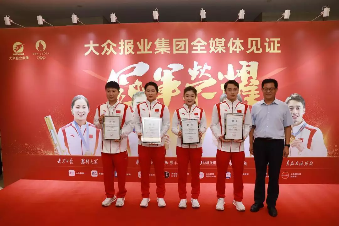 8月26日上午,山东奥运冠军陈梦、练俊杰、李越宏、孙梦雅做客大众报业集团。在“大众报业集团全媒体见证冠军荣耀”现场,山东省文化和旅游厅向这4名奥运健儿颁发“好客山东特邀推荐官”聘书,感谢他们为传播山东美好形象做出的贡献。