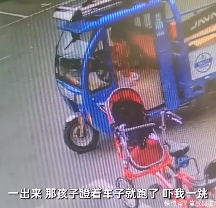 画面显示,男子驾驶着三轮车送货,疑似家中没有人照看孩子,男子只能带着一起送货,可能平常习惯性下车不拔钥匙,结果1岁女儿误踩下了油门,造成三轮车重新启动奔向路边,与一辆白色小车擦肩而过后撞向草丛。